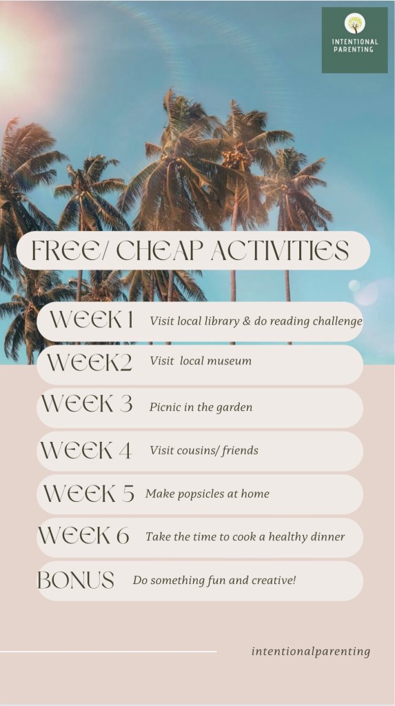 To participate in this SIX weeks summer challenge, join our whatsapp group running from 24th of July to 4th of September. This will be a place to encourage, inspire one another and also share further ideas. Let’s kill the ‘I am bored mantra’ by being prepared and organised parents. Here is to Summer 2023!!